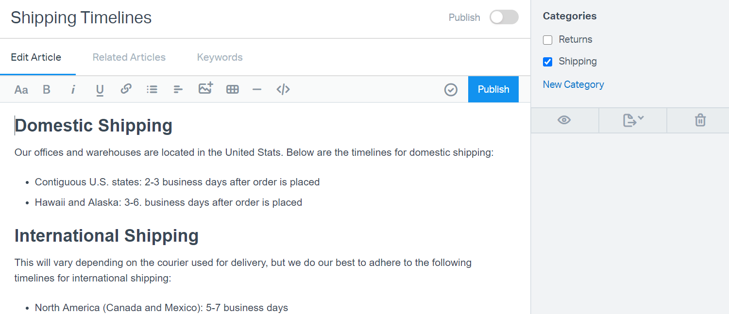 To publish that article again, you can either flip the toggle switch on again, or click the blue Publish button just below that.